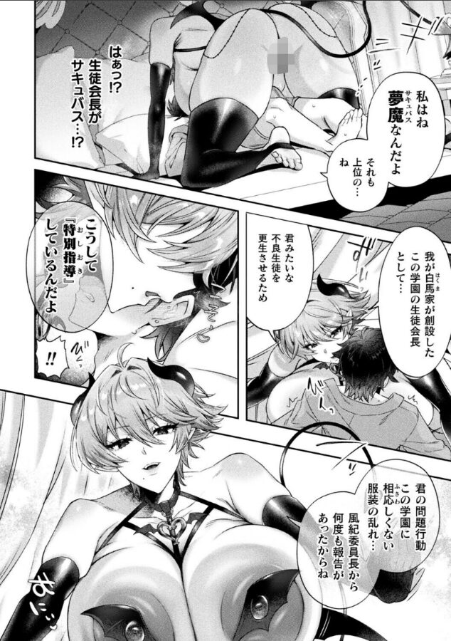 王子様系生徒会長の真の姿はサキュバス!?迫るムチムチボディでお仕置きされる!牛郎は素行の悪さから生徒会長である王子様系女子の白馬トアに呼び出され生徒会室へ訪れるとなぜか気を失ってしまう。牛郎が目覚めると、ブレザーを着こなした普段の出で立ちと打って変わってまさにサキュバスと言わんばかりの派手で際どい姿をしたトアの姿が。彼女は実はサキュバスであり、素行の悪い牛郎に対しおしおきをすると告げ、彼の唇を奪い――。