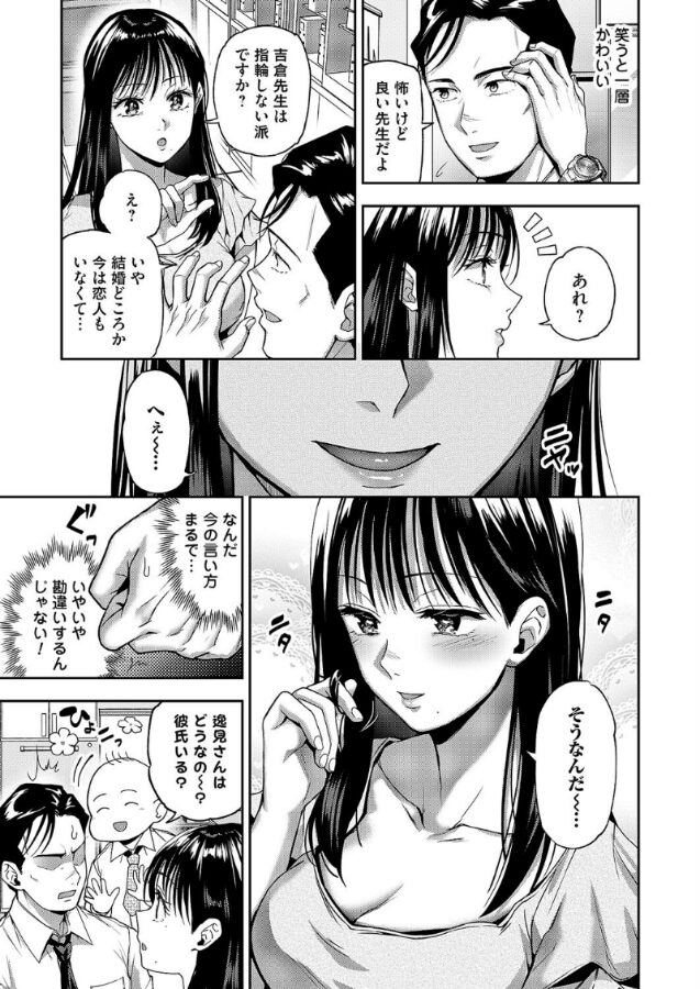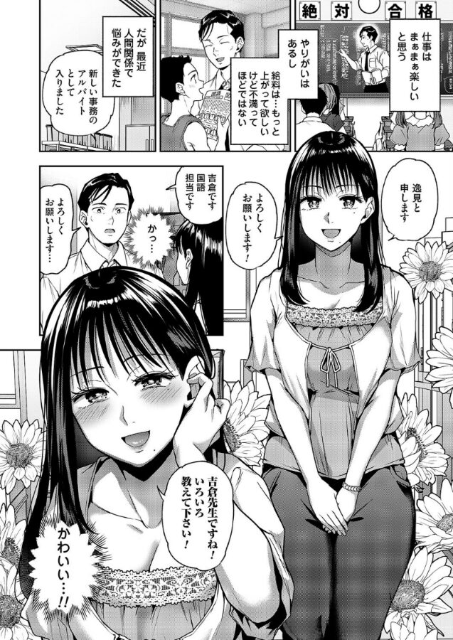 「『好き』っていうのは、『セックスしたい』って意味ですよ」とめどない衝動、催す性欲、壊される理性。塾講師とJDアルバイト、禁断の残業を描く長代ルージュの最新作!「ふたりきりになるのは危ういと思っていたんだ」吉倉(よしくら)が先生として働く塾で、事務のバイトをする女子大生・逸見(へみ)。セミロングの綺麗な黒髪と人当たりもいい可愛い子。そして屈んだ時に服からのぞく深くて長い谷間。様々なハラスメントが取り沙汰される昨今、大人として講師として人一倍気を遣う吉倉をよそに、年下の逸見はさりげなく奥さんや彼女がいるのか聞いてくる。加えてフリーで彼氏募集中だと目の前でアピールも…。妖しく吸い込まれそうな瞳。逸見の気持ちを察するが、吉倉にはどうすることもできない。しかしふたりきりの残業で、ついに逸見は好意を真っ直ぐ告げる。逆セクハラになるからとそれでも笑って躱す吉倉。だけどもう逃さない。逸見は吉倉の手を取り、谷間にあてがう。ふっくらたぷたぷ、柔らかくデカすぎる巨乳の間に指が吸い込まれていく。綺麗な顔と胸から必死に目を逸らし本能に抗うも唇まで奪われてしまう。舌と唾液が絡む濃密なキスで吉倉はついに逸見の服を脱がし、たわわに実った爆乳と乳首にむしゃぶりつく。そして逸見にズボンを下ろされ、耳元囁きと手のひらでねっとり亀頭コキと乳首合わせの3点責め。それでもなお、吉倉はその強い理性で抵抗するが…?