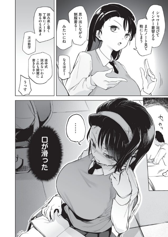 後輩の林道くんに勉強を教える氏家さん。勉強が全然頭に入ってこない林道くんにコツを教えるつもりで毎日の習慣に組み込んで無意識に覚えるようにと自分の例を話したときに、つい日課のオナニーもしゃべってしまう。林道くんにオナニーって?と聞き返されると強がってオナニーなんて普通でしょと正当化してしまう。林道くんにカミングアウトしてから逆に成績を落とした氏家さんは勉強に集中するために一緒に勉強とオナニーをしようと提案し…!?