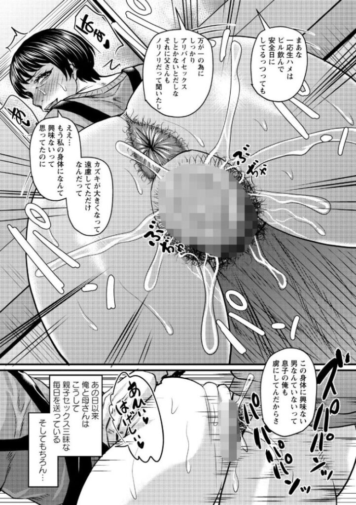 ついに母親を〇すことに成功した主人公。しかし、肉欲の日々を過ごすうちに、孕ませたいと思うようになる――ついに迎えた危険日。それまでの禁欲で、母の股間は大洪水★挿入だけで絶頂し、禁断の濃厚実子ザーメンを子宮にお出迎え★爛れた近親SEXを描く人気シリーズ、ついに完結!