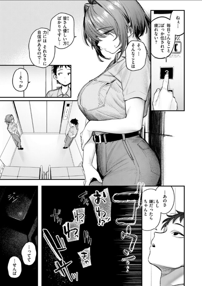 「…まだ出たくありません…」デザイン志望で採用されたのにも関わらず、いつも雑用の力仕事を押し付けられている2つ下の後輩の小森(こもり)さん。ある日の夜中、小森さんの雑用に手を貸していると、老朽化で故障したエレベーターに閉じ込められてしまった俺たち。先輩の俺を巻き込んでしまったことに凹む小森さんに、元々寡黙なイメージはあれど「もっと自己主張してもいい」と伝えると、コールセンターに連絡しようとした手を遮ってきて……。急に押し倒され、密着したことから勃起してしまった俺のち○こ。躊躇いなくフェラしてきた小森さんと密室SEXがはじまる――