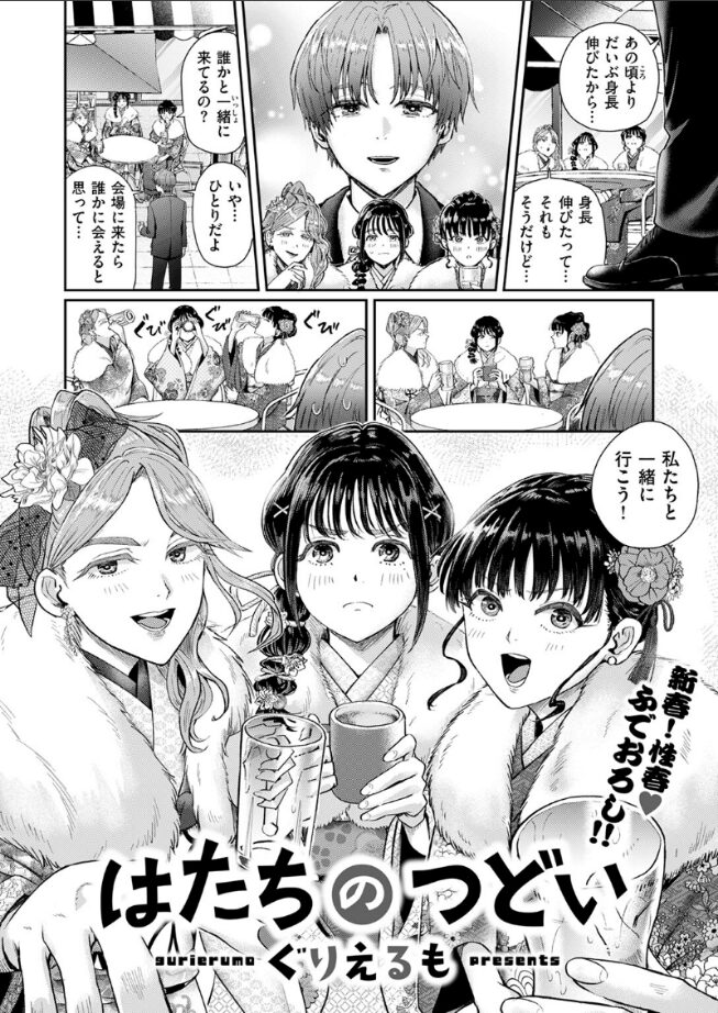 成人式のガールズトークで冴えない近況を語り合う女子3名。今日彼氏つくっちゃえば〜? なんて軽口を叩いていると見知らぬイケメンに声を掛けられる。ナンパ……ではなくて、それはかつてのクラスメイト・五十嵐(いがらし)の変貌した姿だった!!ぼっち陰キャだった過去から友達が居ないという彼。これをチャンスと目くばせして4人で一緒に行動することに。――超イケメンなのにウブで可愛い奇跡の内面を両立する五十嵐くんが、式典中にW手コキされちゃったり、式後に見せオナ(フェラ付き)させられたり、夜の同窓会のあとは…おたのしみの時間だったり……!?振袖×複数×ぐりえるもワールドで魅せる一生モン性人式メモリー。