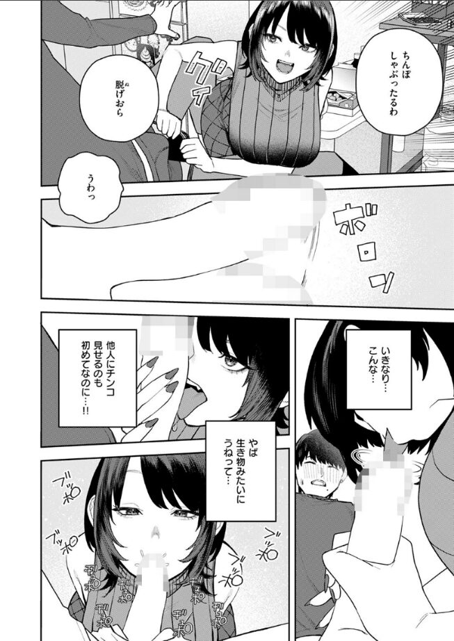 「このあと抜けだして〜お姉さんとおせっせしよかぁ?」新歓コンパで大人しくソフドリ飲んでやり過ごしていた蛙田(かえるだ)くん。ぶっちゃけ大学デビューでいまいちはっちゃけ方もわからない。そんな彼に、童貞喰いのサセ子さん・蛇塚(へびづか)先輩が忍び寄る……!!あっというまにおうちにおもちかえり。ニュートラルなテンションで下ネタぶっぱなしてくる先輩にたじたじになりながらもあっというまにオーラル開始!?(この先輩…エロすぎだろ……!!)