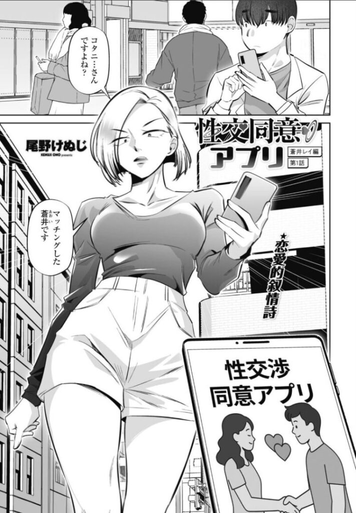 性交同意アプリで高身長美人の蒼井とマッチしたコタニ。最初はツンツンしてた蒼井だが、エッチが始まるとお互い相性の良さに……尾野けぬじ「性交同意アプリ 蒼井レイ編 第1話