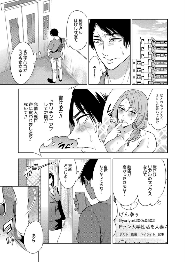 大学生の雄一はSNSのエロアカウントでヤリチンアピールをしている童貞だったが、近所に住む欲求不満な人妻・桃原さんに童貞を食われてしまった!