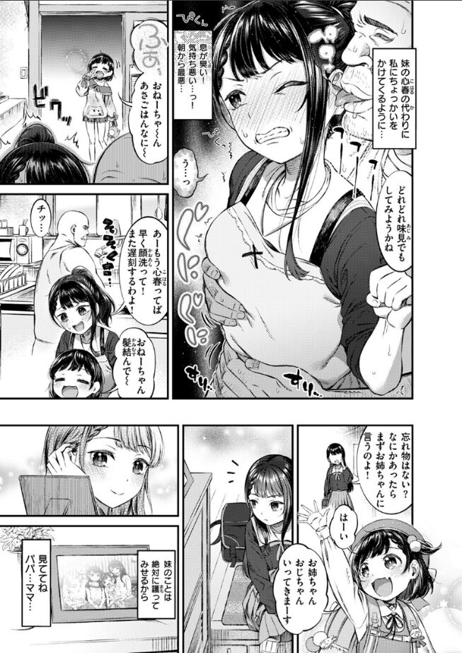 (妹のために…私が耐えなきゃ…)両親を事故で亡くし、叔父を名乗る男に引き取られた美冬(みふゆ)と心春(こはる)の姉妹。下品で不潔な叔父から妹を守るため美冬はセクハラに耐え続けるが、ついに無理やり処女を奪われてしまう。しかもそれを心春に目撃され美冬は気を失うが、目を覚ますとそこには楽しげに腰を振る妹がいて……?