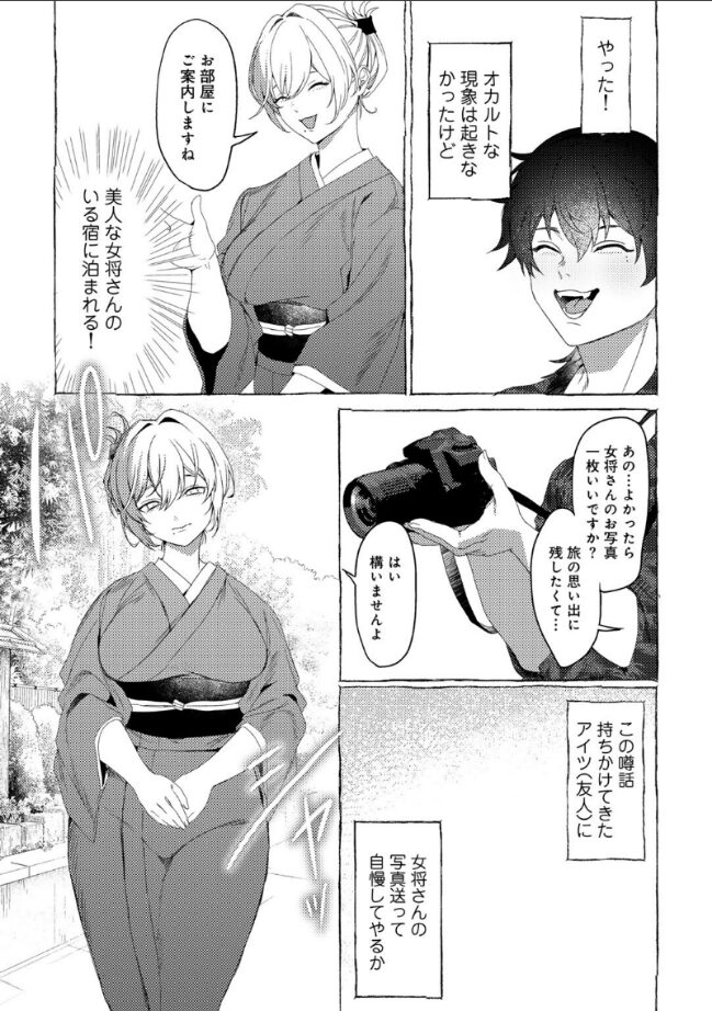 妖しい美人女将の性的サービス!?怖い話が大好きな青年は、友人から教えてもらった田舎の心霊スポットにやってきた。現地で見つけた、雰囲気ある旅館に泊まる事にするのだが、他にお客はいなく、部屋も温泉も広い旅館に大満足の青年。しかも、美人女将による陰茎マッサージ、ちんぐり返し搾精など、なぜか性的サービスが盛りだくさんで――。(COMICグーチョvol.22 掲載作品)
