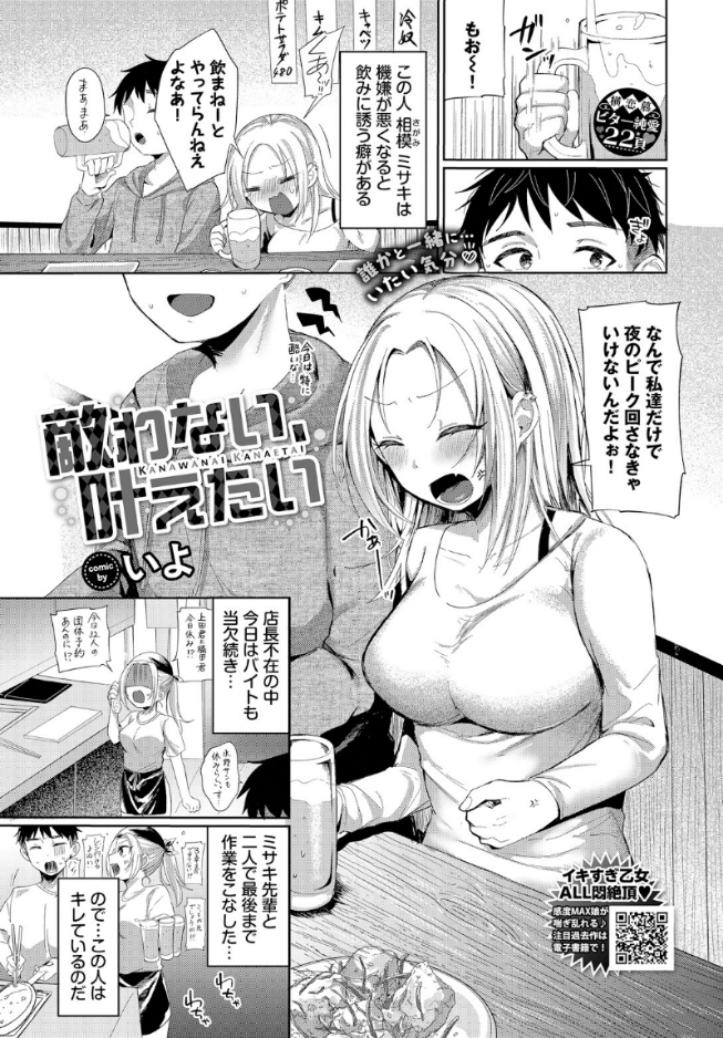 【あなたを独占したい…彼持ち年上女子とのワンナイト!】羞恥絶頂コミッカー・いよが描く、トロトロ求愛SEX!バイト先の先輩・ミサキに想いを寄せる主人公・旭。しかし、ミサキには旭と同じ大学に通うマッチョな彼氏がいる…。ある日バイト終わりに一緒に飲んでいると、ミサキが急に「最近彼とのセックスがレス気味で…」と愚痴をこぼす!そして、性欲解消のために、旭は彼女にラブホへ連れて行かれてしまい…!?