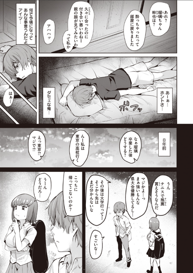 「本当はみっちゃんの事好きだったんだよ」幼馴染の瑠璃(るり)が数年ぶりに田舎に帰ってきたと思ったら、まさかの結婚報告だった。お祝いの飲み会が盛り上がっている中、縁側で黄昏ている俺に好きだったと告白してくる瑠璃。今更の出来事にショックを受けた俺が部屋で寝ていると、横には瑠璃がいて……。おっぱいを触っても起きない無防備な幼馴染の姿に想いは止められず、禁断の中出しSEXへ!!