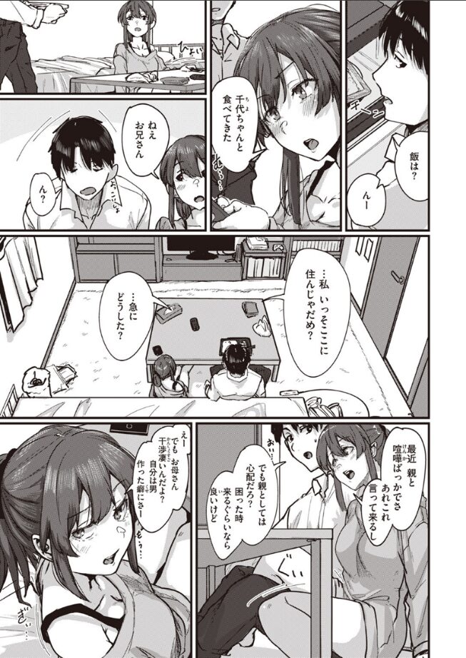 「妹の友達とヤリまくってるのはお兄さんじゃん♪」家出した妹の友達の千佳(ちか)ちゃんを匿ったことをきっかけに、すっかりカラダの関係になったふたり。毎日のように部屋へ訪れる千佳ちゃんから「ここに住んじゃだめ?」と言われてドキリとするが、どうやら親との関係が理由らしい。もちろん大人として断るが「何でもしてあげる」と誘惑されて……。性欲強めの制服女子と本気の中出しSEX♪