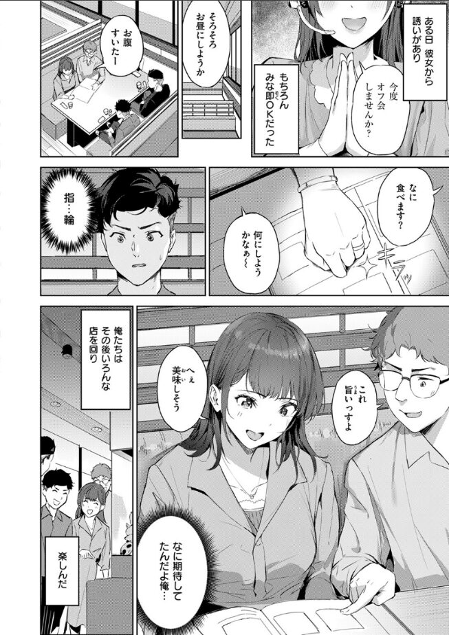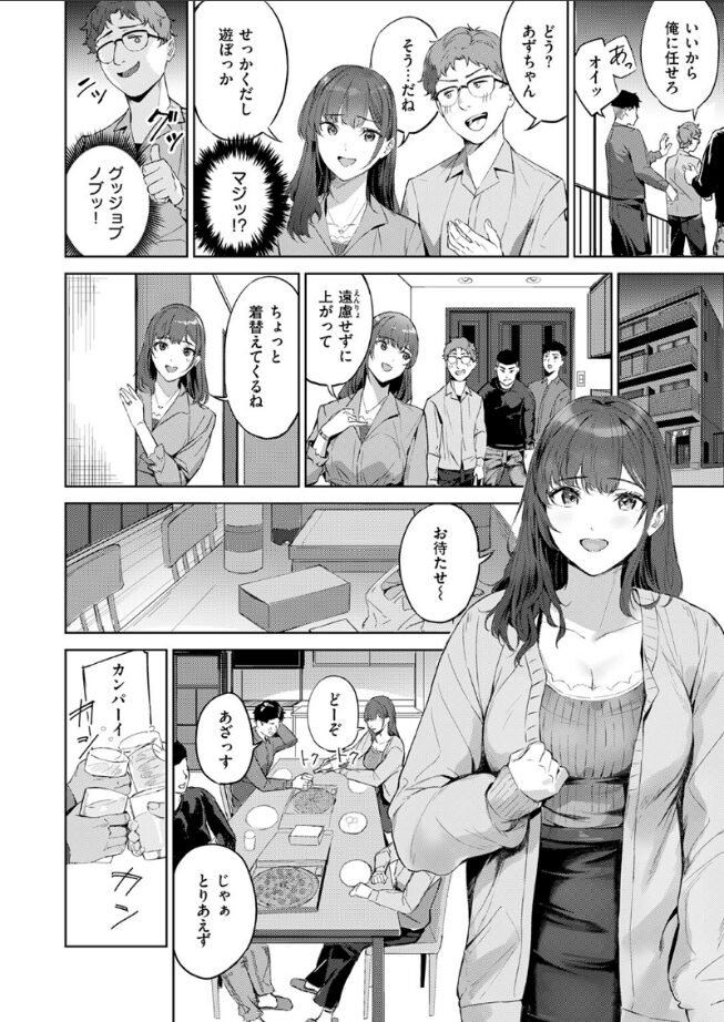 「主人は今…家にいないから大丈夫よ…」新堂(しんどう)は学生時代からの友人2人と一緒に、マルチオンラインゲームで知り合った梓(あずさ)と会う事に。オフ会当日、やってきた彼女は超美女……の人妻だった!お調子者の友人が梓をノせて、旦那が留守だという梓の家で飲む事を提案。無事成功し宅飲みしている中、次第にエロい話で盛り上がり……4Pの宴が始まる!!