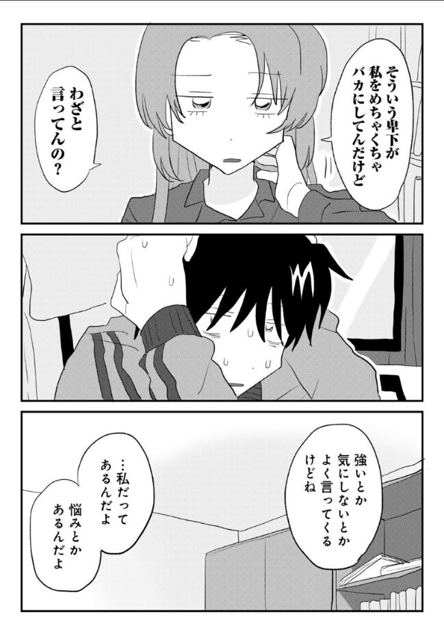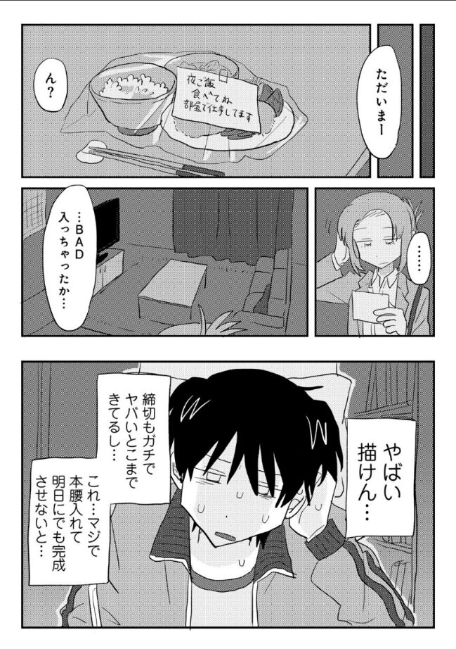 『ファミレスでネーム1ページも進まず、帰宅しました…』とある冴えない漫画家と、一緒に暮らす妻とのおはなし。WEB媒体で細々と食いつなぐギャグ漫画家・翔馬。ネタ切れやアンチコメントに日々苦しむ翔馬を、妻の絵里は明るく支えていた。ある日、〆切で極限まで追い込まれた翔馬は、自信喪失し卑屈にふさぎ込んでしまう。見かねた絵里が掛けた言葉は「私のことバカにしてんの?」という意外なもので――?(COMICキスハグvol.5 収録作品)