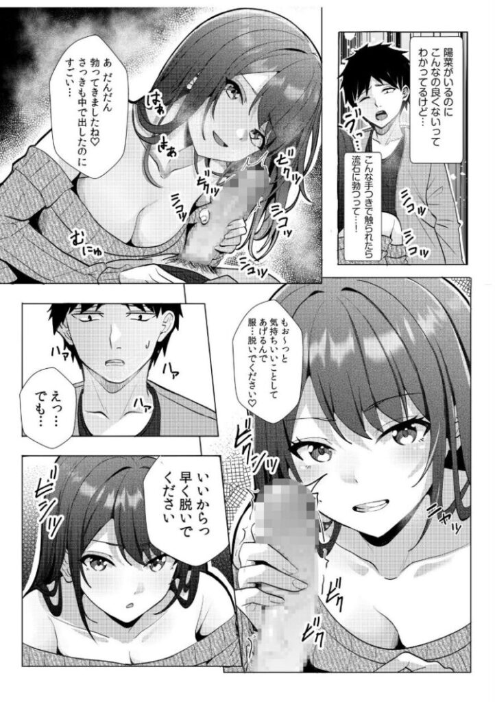「朝陽さんのこと好きなんです」ホテルに2人きりの状況で美咲にそう告げられた朝陽。陽菜への言い訳を考える予定だったはずが、美咲は強引に朝陽のズボンを下ろし、美咲はまだ勃っていないち●ぽを恍惚とした表情で舐め始める。(陽菜がいるのにこんなのよくないってわかってるけど…)罪悪感と葛藤していると、美咲はハーフパンツから除くむっちりとした太ももで朝陽のち●ぽを扱き始めて…「ダメダメっていいつつ、ここは正直ですね」これ以上はまずいって…!
