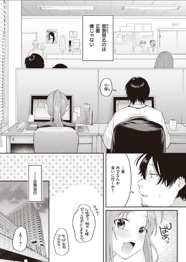 「命令して……いじめてください……♪ いつもみたいにいっぱい怒って……」仕事の覚えは悪く、なにかと手がかかる会社の爆乳新人・小柴(こしば)と、出来の悪い妹のような感覚で面倒を見てあげている先輩。年の差10歳のふたりが出張先のホテルで急接近!?小柴のミスでカップルプランを予約してしまったようで……。