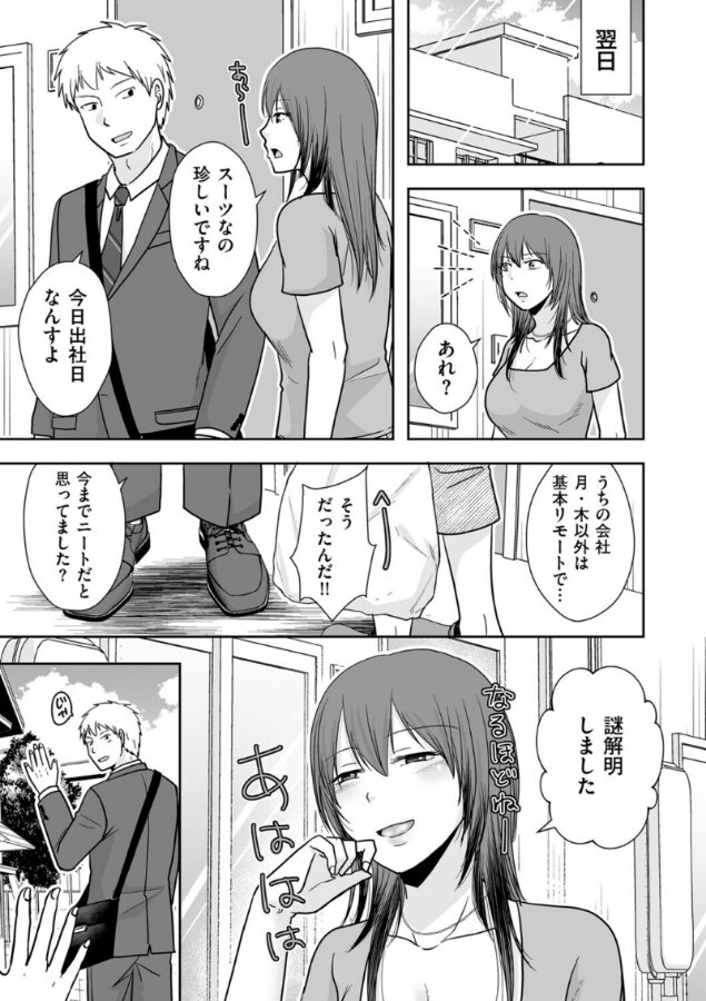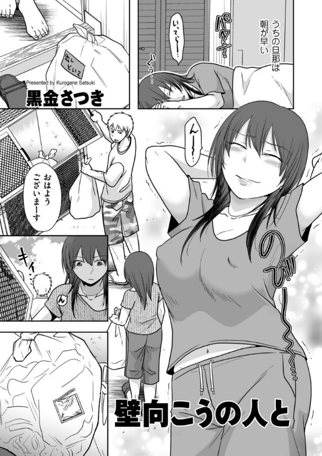 同じマンションのお隣さんが出したゴミの中に、使用済みのコンドームを見つけた。お隣さん、セックスしてたんだ……。この建物、壁薄いのに気付かなかったな……。そんなことを考えていた日の翌朝、たまたまそのお隣さんと鉢合わせた。どうやら今日は出社日らしい。出社日ってことは、当分帰ってこない……!ってことは、物音気にせずオナニーできる……!そうして存分にオナニーを楽しんでいたところ、急にインターホンが鳴った。今日何かあったっけ……?出ると、お隣さんが立っていた。あれ……? どうしました……?